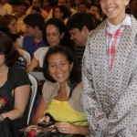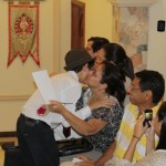 Los jóvenes participantes, después del teatro, obsequiaron a sus mamás un hermoso recuerdo consistente en una hermosa rosa y una tarjeta con la foto de la Madre de todas las madres.