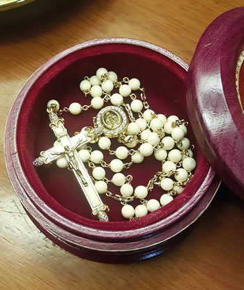 Acto seguido, los sacerdotes le entregaron el estuche que contenía el regalo, una pequeña caja hecha de palo brasil, explicándole que era aquella la madera de cuyo árbol proviene el nombre del país. En su interior estaba el rosario. Al verlo, Benedicto XVI y Mons. Gänswein reaccionaron al unísono, elogiando su belleza y afirmando que se trataba de un tesoro. Le fue esclarecido, sin embargo, que la intención era ofrecerle algo que, perteneciendo a la tierra, de alguna manera tocase el Cielo, por ser destinado a Su Santidad. A lo cual sonrió y respondió: “Especialmente precioso no tanto por su valor material, sino sobre todo como un regalo espiritual”.