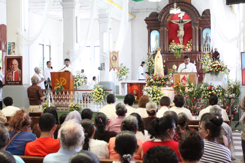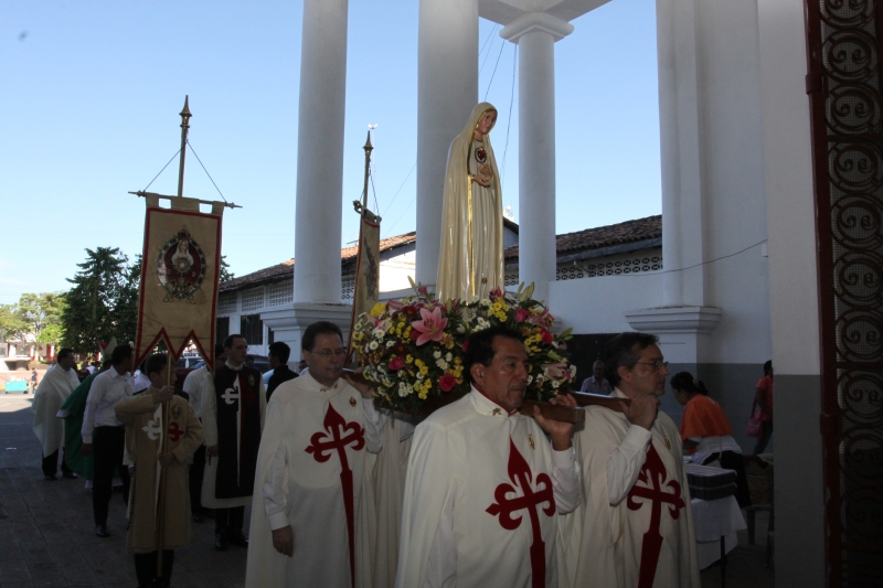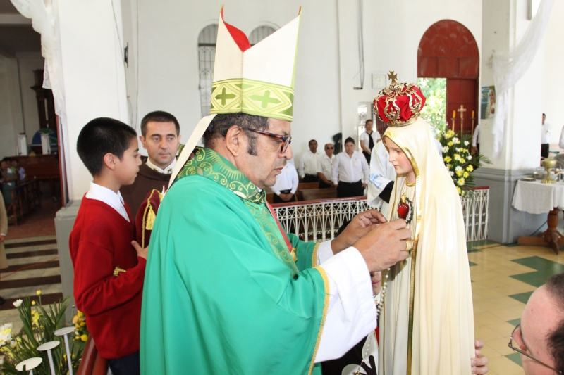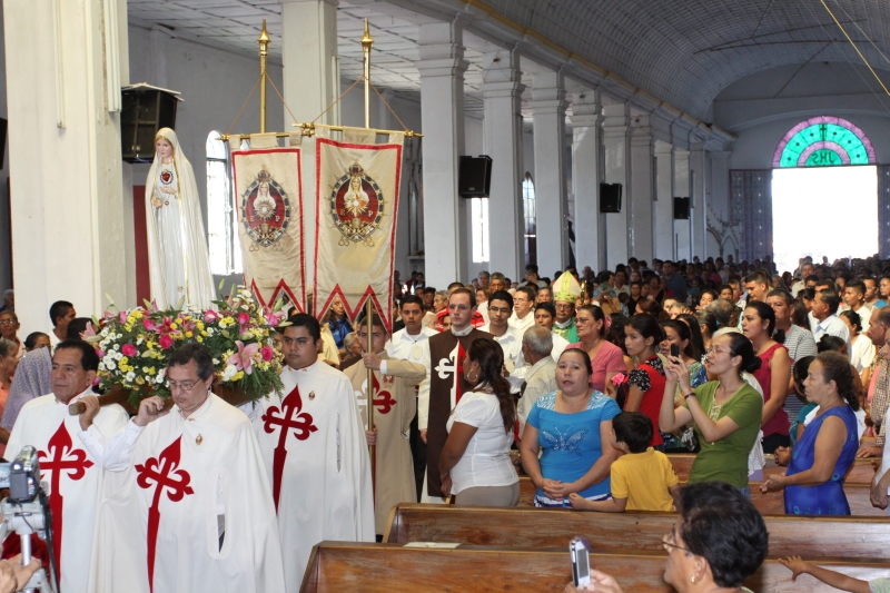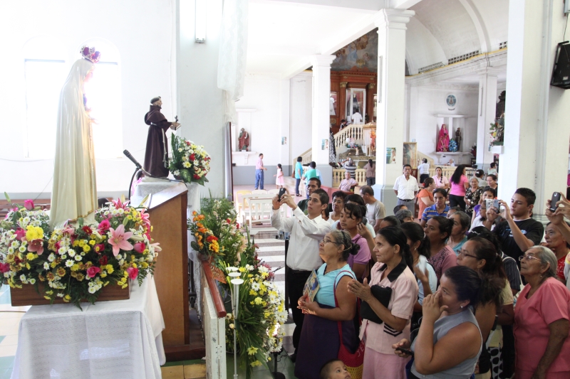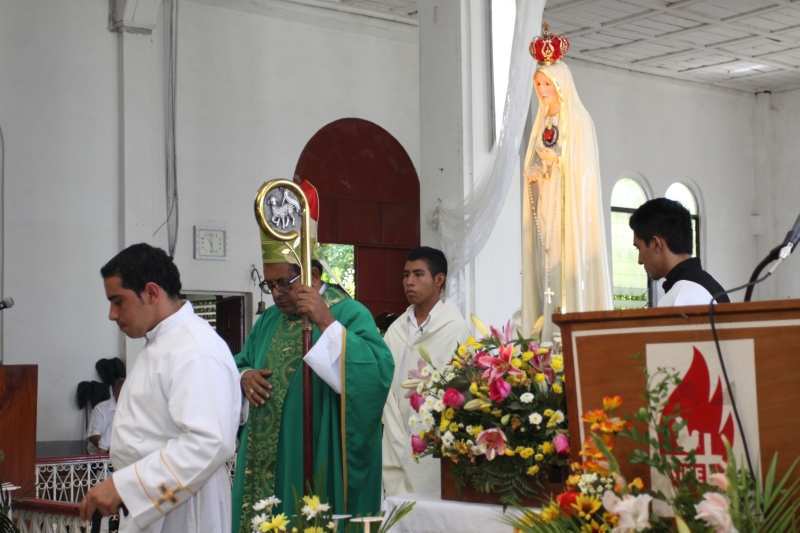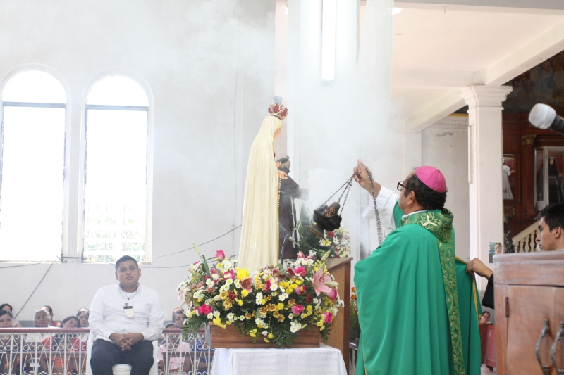 A las 8:00 a.m. se dio inicio con las palabras de bienvenida del Obispo Mons. Elías Samuel Bolaños y el rezo del Santo Rosario. Después del Santo Rosario hizo el ingreso la imagen peregrina del Inmaculado Corazón de María de Fátima al templo, donde fue coronada solemnemente por Mons. Elías Bolaños, con una lluvia de aplausos, y así dio inicio a la Santa Misa.